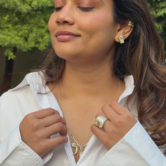 Eva Necklace — a modern talisman uniting three powerful motifs: Vagh Nakh for strength, Crescent for balance, and Trillion for individuality. An everyday luxe piece that shines solo or layers effortlessly from day to night.